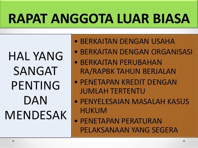 The collection that consisting of chosen picture and the best among others. Rapat anggota luar biasa yang diselenggarakan untuk memutuskan penggabungan peleburan atau pembubaran koperasi dianggap sah apabila mencapai kuorum dihadiri oleh paling sedikit 34 tiga perempat jumlah anggota dengan hasil keputusan dianggap sah apabila disetujui oleh paling sedikit 23 dua pertiga jumlah suara yang sah. Rapat umum pemegang saham rups terdiri atas rups tahunan dan rups lainnya dalam penjelasannya dinyatakan bahwa. Contoh surat undangan rapat anda tentu pernah menghadiri sebuah acara rapat entah rapat rt rapat karang taruna rapat acara kepanitiaan rapat dengan klien di perusahaan rapat direksi dan lain lain.