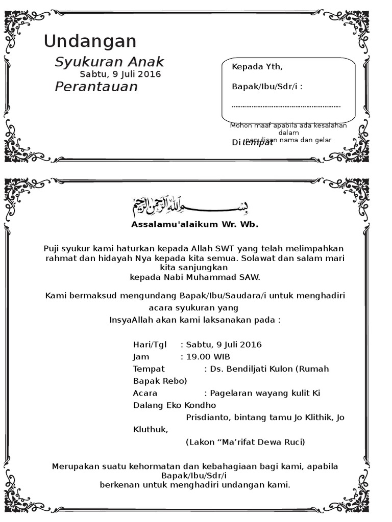 Contoh undangan syukuran anak. Syukuran sendiri di bagi menjadi berbagai macam mulai dari syukuran kelulusan diterima di rumah baru syukuran pernikahan syukuran karena mempunyai anak dan syukuran setelah pulang haji. Pada artikel belajar office ini akan memberikan contoh latihan ms word yaitu membuat format ucapan syukur kelahiran dan doa agar kelak si kecil menjadi anak yang berguna dan berbakti format ini biasanya diletakan atau ditempel pada bungkus makanan sebagai bekal yang disajikan untuk undanganberikut contoh. Format penulisan syukuran kelahiran bayi. Meski sudah sudah teknologi yang super canggih surat tetap diperlukan untuk berbagai kepentingan.