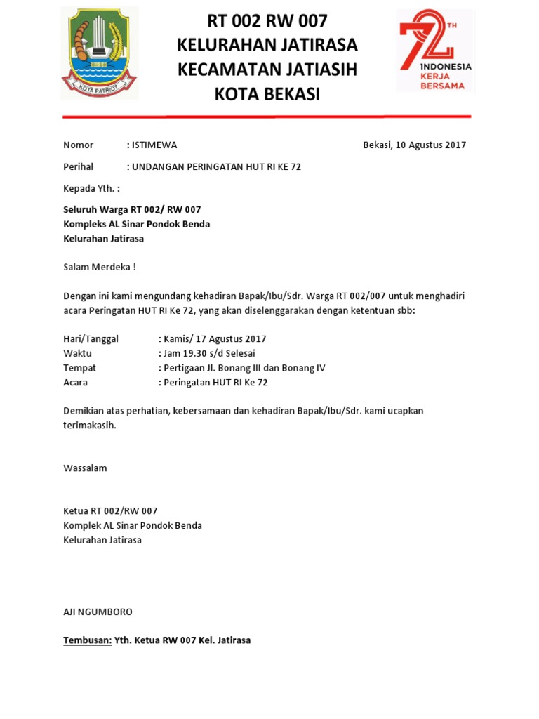 Undangan rt. Ada sebuah kegiatan arisan yang diikuti oleh ibu ibu yang berada di lingkungan rt. Seringkali ketua rt mengirimkan surat undangan rapat rt kepada kepala keluarga ketika ada sesuatu hal penting untuk dikoordinasikan secara bersama sama pada ruang lingkup rt. Kumpulan contoh surat undangan pemilihan rt yang benar 2019. Contoh surat undangan pemilihan rt have an image from the othercontoh surat undangan pemilihan rt it also will include a picture of a kind that may be seen in the gallery of contoh surat undangan pemilihan rt.