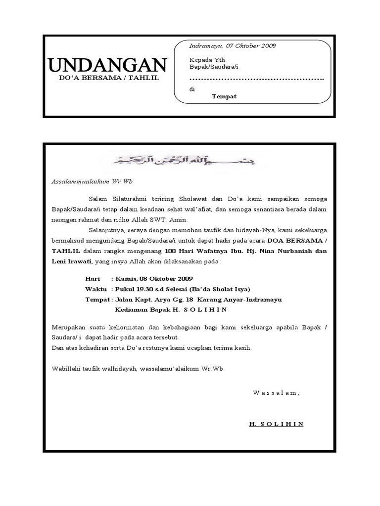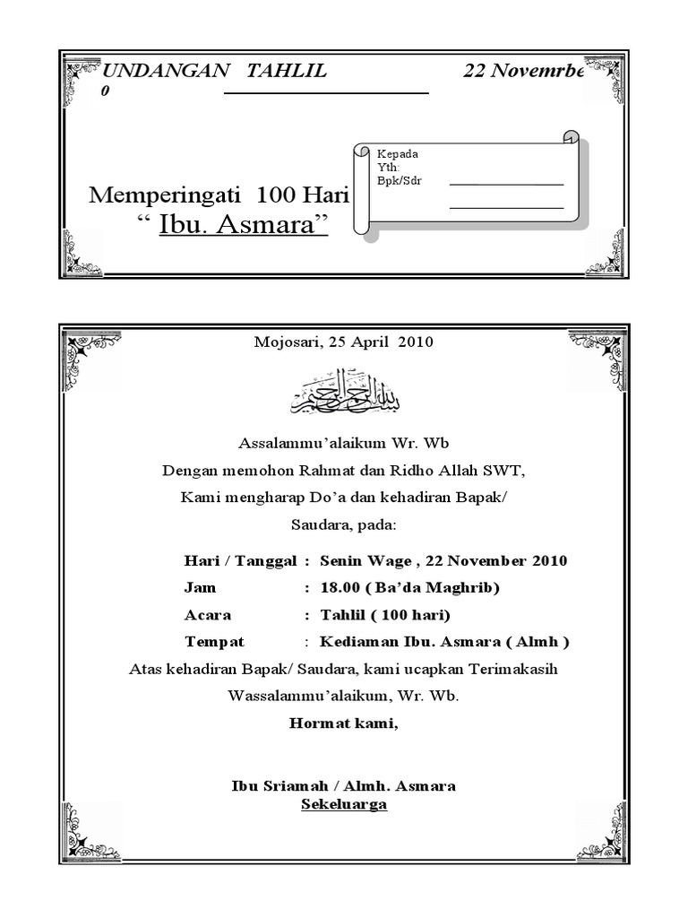 Apakah kamu sedang mencari Undangan Tahlil 100 Hari ? Jika benar maka kamu sudah membuka halaman website yang tepat. Pada post kali ini kamu bisa mendapatkan informasi mengenai Keren Nih Undangan Tahlil 100 Hari.