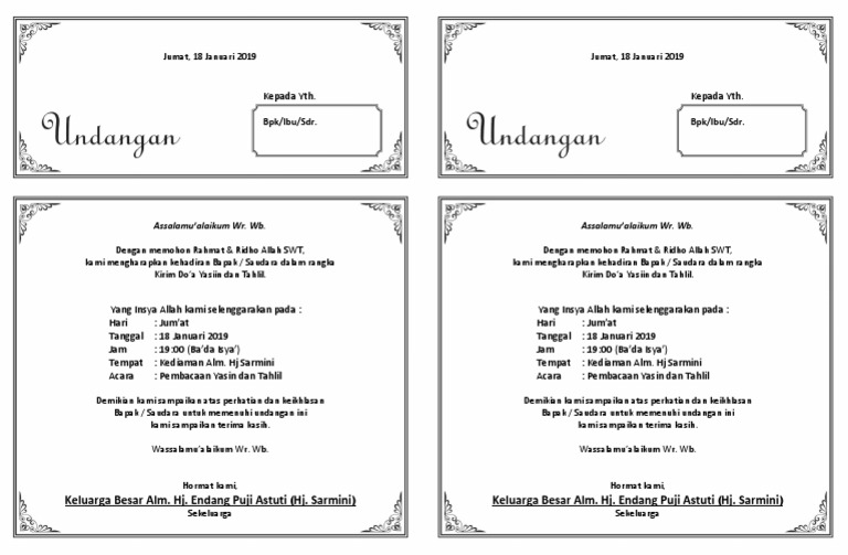 Apakah kamu sedang mencari Undangan Tahlil Word ? Jika benar maka kamu sudah membuka halaman website yang tepat. Pada post kali ini kamu bisa mendapatkan informasi mengenai Lagi Trend Undangan Tahlil Word.