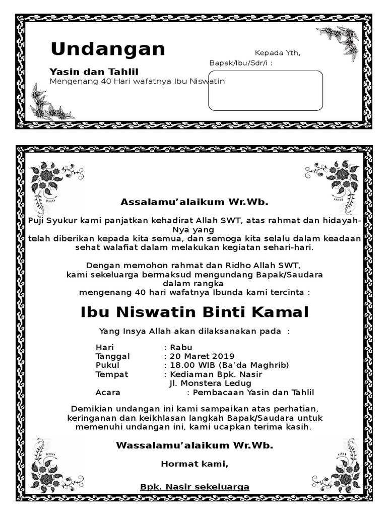 Word undangan tahlil lengkap docx. Kegiatan tahlilan merupakan acara selamatan yang dilakukan oleh sebagian umat muslim di indonesia yang tidak lain bertujuan untuk mengenang dan mendoakan orang yang telah meninggalwafat. Contoh surat undangan tahlil 40 100 1000 hari. Sehat walafiat dalam melakukan kegiatan sehari.