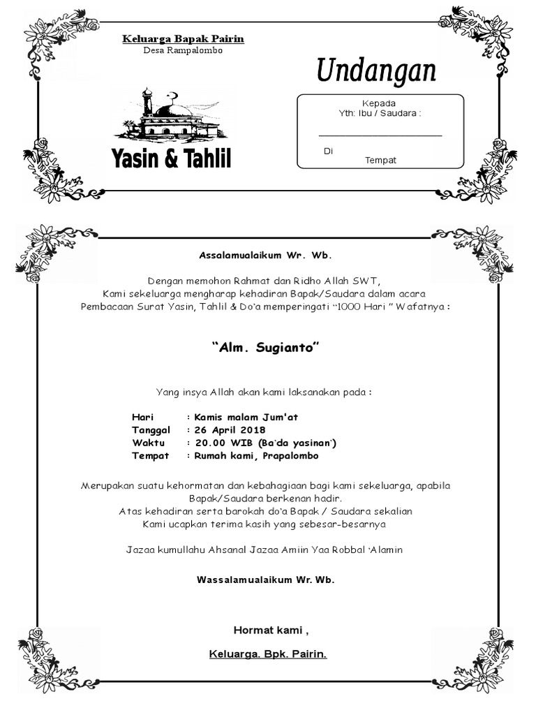Cukup sampai disini informasi mengenai Keren Nih Undangan Yasinan Doc yang bisa kami bagikan. Semoga bisa menambah wawasan untuk kalian semua